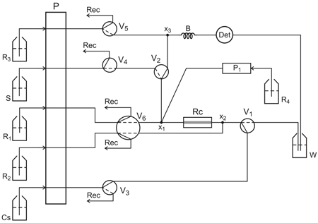 Diagram of the multicommuted flow system showed in the standby condition. Under this configuration, all solutions are pumped back to their storing vessels, resource used to save reagent solution.