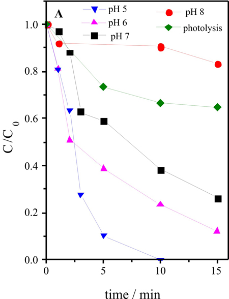 Diclofenac oxidation efficiency decreased as pH increased, however significant oxidation was obtained at pH 6 and 7 using ammonium iron (III) citrate, achieving 77% and 62% after only 10 min, respectively.