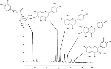 HPLC chromatogram of crude aqueous extract of Cecropia pachystachya leaves and the phenolic compounds identified