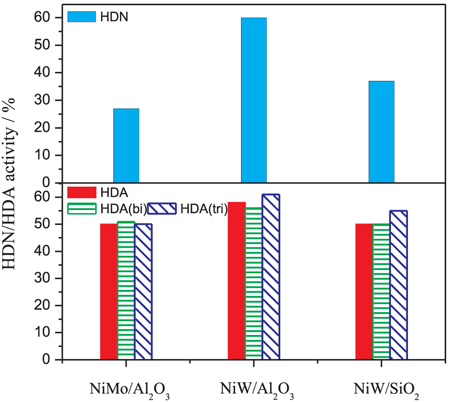 NiMo/Al2O3 shows higher HDN and HDA activities towards the hydrogenation of heavy oil obtained from the direct coal liquefaction process, which are associated with crystallite size and reducibility of metal sulfide, the nature of active sites and acidity.