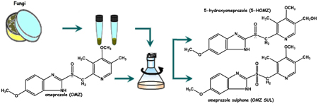 This figure shows the biotransformation process of omeprazole by phytopathogenic and endophytic fungi to obtain 5-hydroxyomeprazole and mainly omeprazole sulfone.