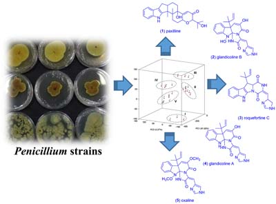 The electrospray ionization mass spectrometry (ESI-MS) and principal component analysis (PCA) provided a simple and effective approach to screening alkaloid-producing endophytic Penicillium strains from Amazon medicinal plants.