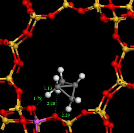 The image shows the calculated structure of the bicyclobutonium cation on the zeolite Y structure, highlighting the hydrogen bond interactions with the framework oxygen atoms.