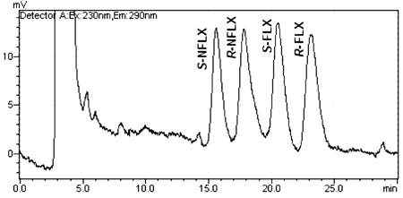 Chromatogram of blank plasma sample spiked with fluoxetine (FLX) and norfluoxetine (NFLX), resulting in 500 ng mL-1, after protein precipitation step and liquid chromatography-fluorescence detection analysis.