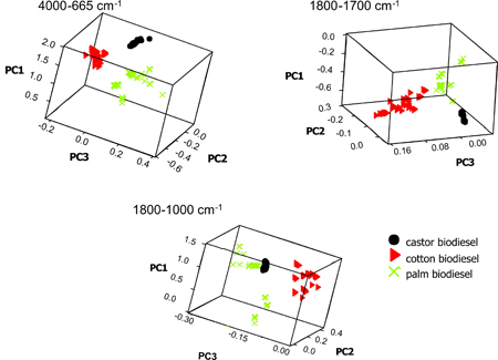 A three-dimensional plot of the first three principal components from biodiesel data. It is possible to distinguish, in each model, three different groups of samples: cotton, castor and palm biodiesel.