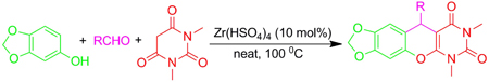 1,3-dimethylbarbituric acid, efficiently promoted in the presence of Zr(HSO4)4 under solvent-free conditions, produced 10-aryl-6,8-dimethyl-6,10-dihydro-5-oxa-6,8-diazaanthra[2,3-d][1,3]dioxole-7,9-diones.