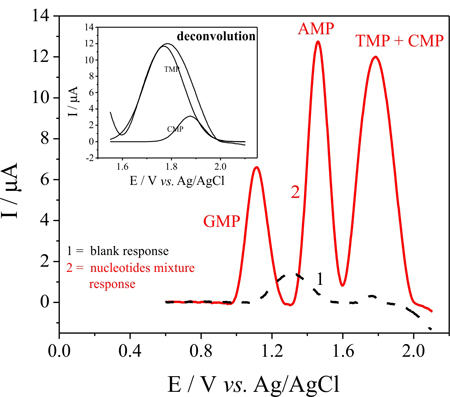 The article presents the individual and equimolar mixture of DNA nucleotide detection using square wave voltammetry on boron doped diamond electrodes cathodically and anodically pre-treated.