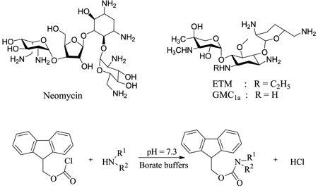 The reaction of amines with FMOC-Cl. Etimicin uses precolumn derivatization (PCD) with 9-fluor-enylmethyl chloroformate (FMOCCl) by a reversed phase separation and subsequent fluorescence detection.