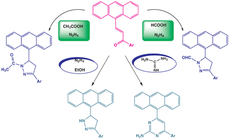 New series of anthracenylpyrazolines and anthracenylpyrimidines were synthesized from 3-(anthracen-9-yl)-1-aryl-prop-2-en-1-one derivatives and spectroscopically characterized. The compounds were evaluated for their antibacterial and antifungal activities.