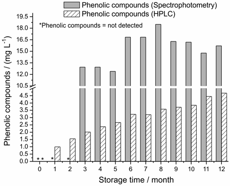 Evolution of the phenolic content of the cachaça during aging in oak barrel, where the phenolic compounds were analised by HPLC and spectrophotometric analysis.