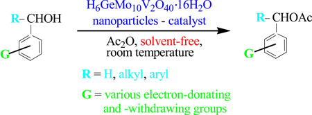 H6GeMo10V2O40•16H2O nanoparticles, as a new heteropoly acid, have been prepared through hydrothermal method and have been used as an efficient heterogeneous catalyst for rapid and selective acetylation of alcohols and phenols with acetic anhydride under solvent-free conditions at room temperature.