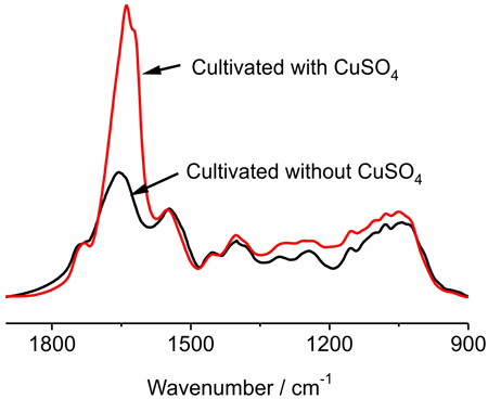 FTIR spectra of Xac cells cultivated with (red) and without CuSO4 (black). The strong peak (red) at 1650 cm-1 in related to the production of pyruvated exopolysaccharides, by the cells, to bind and reduces the copper toxicity.