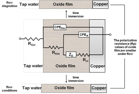 The copper surface immersed in near-neutral aerated tap water shows an increasing film thickness with time that hinders the diffusion of copper species across the oxide layer, which is larger in stagnating condition.