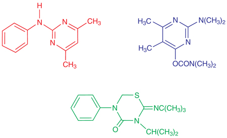 Pyrimethanil, pirimicarb and buprofezin are pesticides used in a variety of cultures and this work showed which one can be determinated in surface waters from irrigated area. The samples were collected from the irrigated regions of Sergipe and Pernambuco States, Brazil, and were prepared by solid-phase microextraction (SPME).