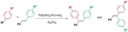 The Heck reaction of trans-stilbene derivatives with aryl halides in order to obtain substituted triarylethenes is described. Findings concerning the influence of halide or olefin electro-donating and withdrawing groups on activity, regio- and stereoselectivity of the Heck reaction are also reported.