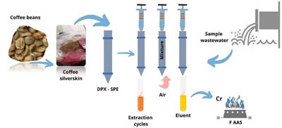Coffee silverskin obtained from industrial waste was successfully used as a new adsorbent to solid phase extraction in a disposable pipette tips (DPX) method. The procedure was capable of determining chromium at low concentrations in sample wastewater according to CONAMA established standards.
