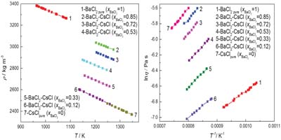 Density and viscosity vs. temperature in high temperature ionic liquids (HTILs) mixtures BaCl2-CsCl.