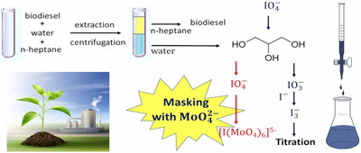 Unreacted periodate masking after glycerol oxidation provided a simple, reliable, fast, and green titrimetric method for glycerol determination, which was successfully quantified in biodiesel.
