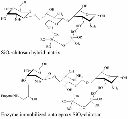 The performance of a silica/chitosan hybrid matrix synthesized by sol-gel process was evaluated, using TEOS as a precursor to immobilize enzymes having potential industrial applications. Lipase from enzyme Burkholderia cepacia was chosen as model system. Support (SiO2-chitosan) and immobilized derivative were characterized with respect to their morphological and biochemical properties.