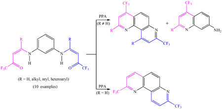 An interesting chemical behavior for cyclization reactions of a variety of enaminones was described. Selective routes of ring closure were also observed, including direct cyclocondensations, hydrolyses and recombinations, which simultaneously furnished fused bis-(trifluoromethyl)-diazatricycles and 7-aminoquinolines.