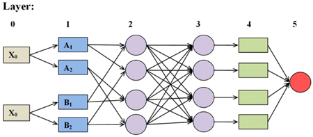Adaptive neuro-fuzzy inference system (ANFIS) has five layers in which layers 0 and 5 represent the descriptors and response, respectively. In this study, ANFIS was employed to predict the partition coeffiction of migrants in food/packaging systems. Forty four systems consisted of 4 food stimulants, 6 migrants and 2 packaging materials were studied.