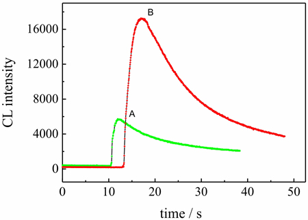 d-Penicillamine can dramatically enhance the chemiluminescence(CL) intensities of the novel reaction system: the reaction between Ag(III) complex with luminol. Chemiluminescence spectra: A, Luminol- [Ag(HIO6)2]5- system; B, d-Penicillamine-luminol-[Ag(HIO6)2]5- system.