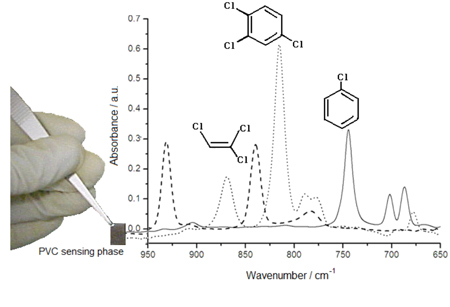 PVC sensing phase used for extraction of hydrocarbons from water and the absorption spectra obtained for chlorobenzene, trichloroethylene and trichlorobenzene.