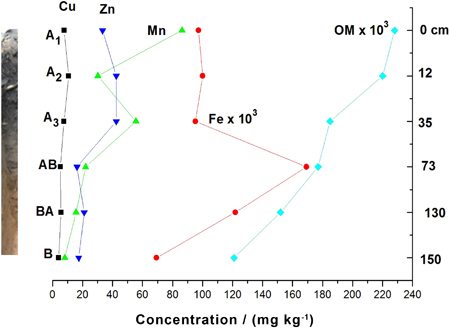 Availability of micronutrients (Cu, Fe, Mn and Zn) and organic matter (OM) showing the relationship between their concentrations along the soil profile at an archaeological site Terra Preta 2, district of Juruti, Pará State.