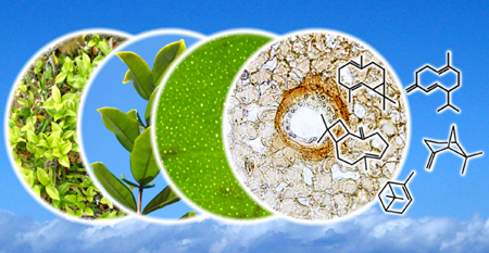 The graphical abstract shows the morphology of Eugenia neonitida in its habitat and the secretory cavities that accumulate the essential oil and from which it volatilizes. The chemical structures are α-pinene, β-pinene, β-caryophyllene, germacrene D and bicyclogermacrene, the major compounds of both studied species essential oils.