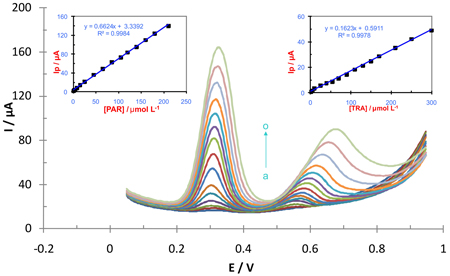 Differential pulse voltammograms and the corresponding calibration curves obtained for various concentrations of paracetamol and tramadol at a multi-walled carbon nanotube-modified glassy carbon electrode under optimum conditions.