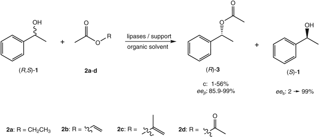 Lipases from different sources were immobilized on ginger starch film or ginger starch/PEO blends. These biocatalytic systems were used in the resolution of (R,S)-phenylethanol with vinylacetate, ethyl acetate, iso-propenyl acetate and acetic anhydride.