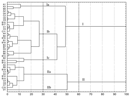 Cluster analyses according to general inputs (fecal, terrestrial or marine sources) in the total sterols to the sediments from Paranaguá Estuary. Group I distinguish stations where the proportion of sterols from marine sources is higher while Group II contains the stations where the fecal sterols is extremely low and terrigenous sources are slightly predominant.