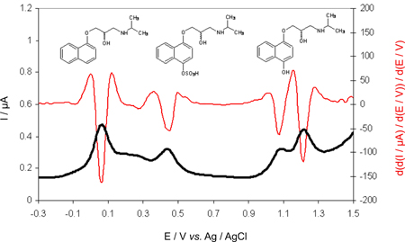 The voltammetric methods for propranolol and metabolites were proposed. The differential pulse voltammetry method on glassy carbon electrode could be used for simultaneous determination of mentioned species in urine sample after the enrichment step.