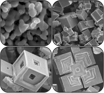Morphology evolution of MAPbI3 particles from irregular morphology to well-defined cubic and hopper-type morphology obtained by varying the reaction conditions.