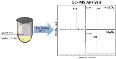 Tetradecanoic acid was pyrolyzed under inert atmosphere at 450 and 600 ºC, using catalysts γ-Al2O3 and Nb2O5. Partially deoxygenated compounds were obtained, the main product being 14-heptacosanone (K27).