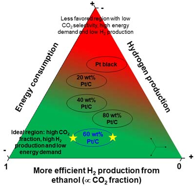 Platinum weight percent (wt.%) in the catalyst formulation influences the performance of a high temperature (up to 175 °C) ethanol electroreformer in terms of energy demand, hydrogen production and efficiency of ethanol to CO2 conversion. The optimal conditions are achieved using the 60 wt.% Pt/C catalyst.