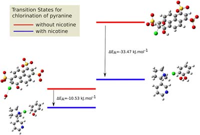 Hypochlorous acid (HClO) is an endogenous oxidant, and nicotine is the primary addictive component of tobacco smoke. Nicotine catalyzes the chlorination of biomolecules. This paper describes the mechanism of the catalytic effect of nicotine.
