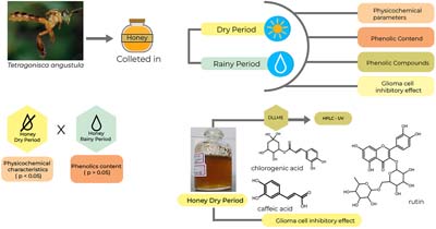Tetragonisca angustula stingless bee honey collected in dry and rainy periods were subjected to analysis of physicochemical parameters, phenolic content, identification of phenolic compounds by high-performance liquid chromatography with ultraviolet detection (HPLC-UV) and glioma cell inhibitory effect.