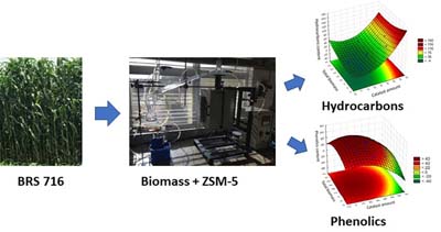Samples of biomass sorghum BRS716 were submitted to fast catalytic pyrolysis to produce a bio-oil rich in hydrocarbon or phenolic compounds after optimizing the suitable critical process parameters using a response surface methodology approach.