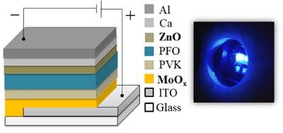 Solution-processed metal oxides based on low-cost materials and synthesized by facile routes were used applied as charge transport materials in blue light-emitting diodes containing the polymer poly(9,9-dioctyl-9H-fluorene-2,7-diyl) as emissive layer. The morphological properties of the oxides were tuned and used to boost the diode performance, leading to an enhancement of almost one order of magnitude in the luminance. Details are presented in the Article Metal Oxide Films as Charge Transport Layers for Solution-Processed Polymer Light-Emitting Diodes by Andreia de Morais and Jilian N. de Freitas on page 377.