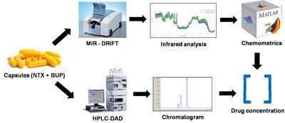 Capsules with naltrexone (NTX) and bupropion (BUP) were analyzed by mid-infrared spectrometer using diffuse reflectance (DRIFT) accessory. The spectrum was acquired in absorbance and the sample concentration was quantified using the mathematical algorithm partial least squares (PLS).