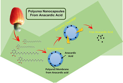 Polyurea nanocapsules were prepared by inverse miniemulsion via interfacial polyaddition for controlled release of anacardic acid.