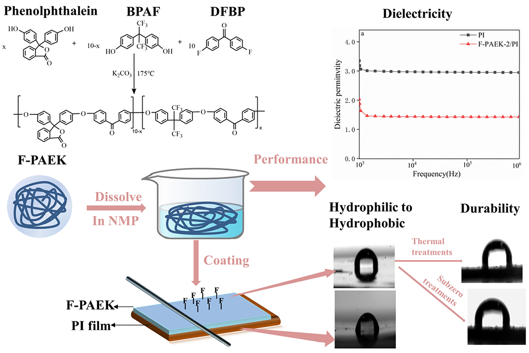 Hydrophobic modification of polyimides (PI) films was successfully prepared using fluorinated polyaryletherketones (F-PEAKs) coated on PI films, and the water static contact angle of the films reached 128°. After extreme treatment, the modified films still maintained hydrophobicity.