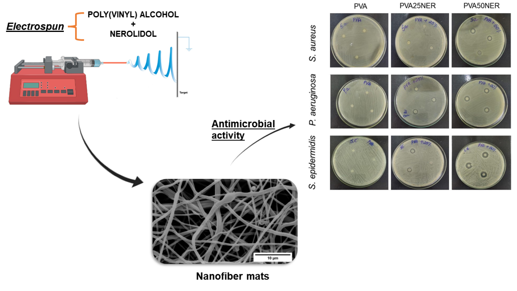 This work reports the incorporation of a non-polar antimicrobial agent (nerolidol) to polar electrospun nanofibers (based on poly(vinyl alcohol)). The effects were regarding homogeneity of the fibers, contact angle, thermal and aqueous stability, and antimicrobial activity.
