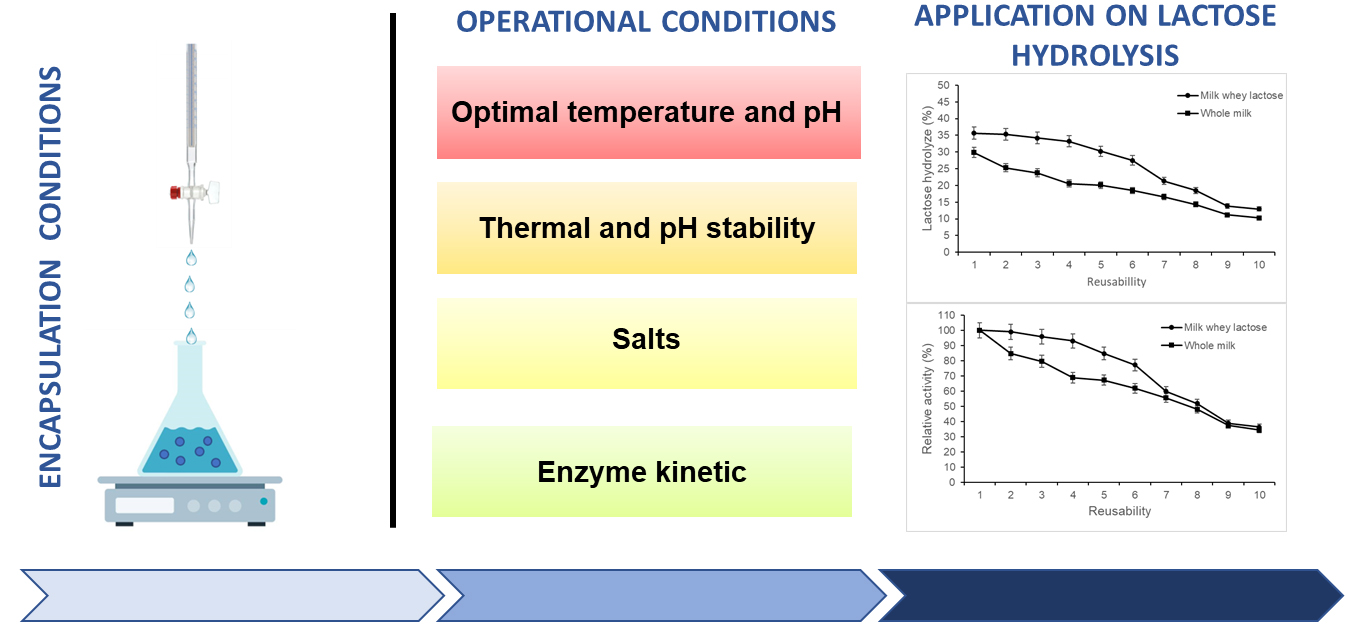Glutaraldehyde-crosslinked beta-galactosidase was encapsulated using a pectin-alginate hydrogel matrix. In this technique, the thermal stability of the enzyme was improved and proved to be efficient for application in the hydrolysis of lactose in whey and whole milk.