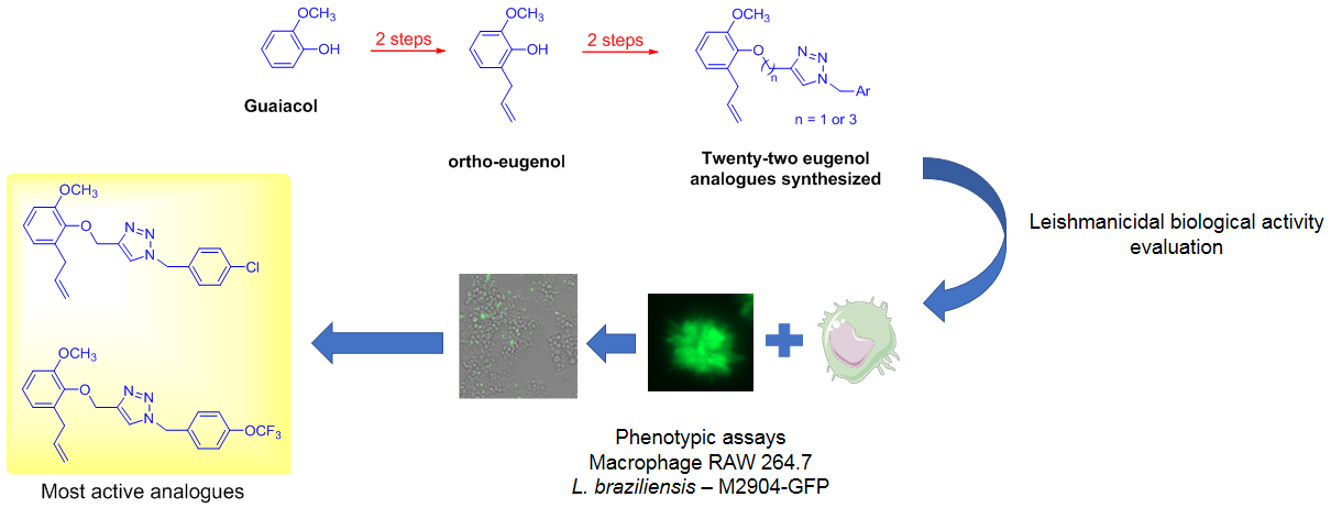 Twenty-two new eugenol containing 1,2,3-triazole analogs were synthetized and evaluated against intracellular Leishmania braziliensis.
