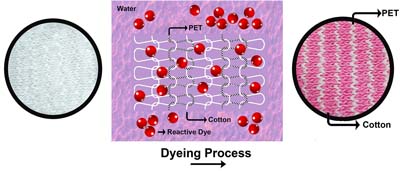 Representation of the dyeing process for cellulose-polyethylene terephthalate (PET) blends with a reactive dye in an aqueous medium.