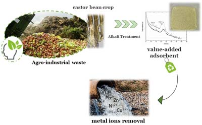 Turning agricultural waste into a value-added adsorbent promotes a positive environmental impact. Castor stalks waste is highly abundant and inexpensive, and alkali treatment boosted its adsorption capacity. Castor stalk showed to be a high-performance and low-cost adsorbent.
