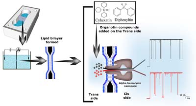 Stochastic biosensing is based on the observation of individual events reversible binding between molecules of organotin compounds (OTCs) and a single nanopore α-hemolysin (αHL). These current traces are recorded and stored, creating a unique digital signature that allows identification of the molecule under study.