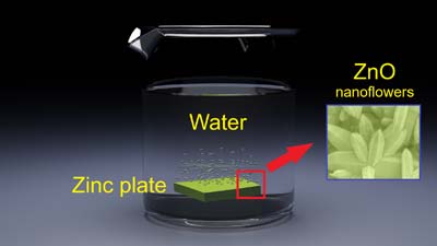 ZnO nanostructures synthesized by simply immersing Zn plates in water.